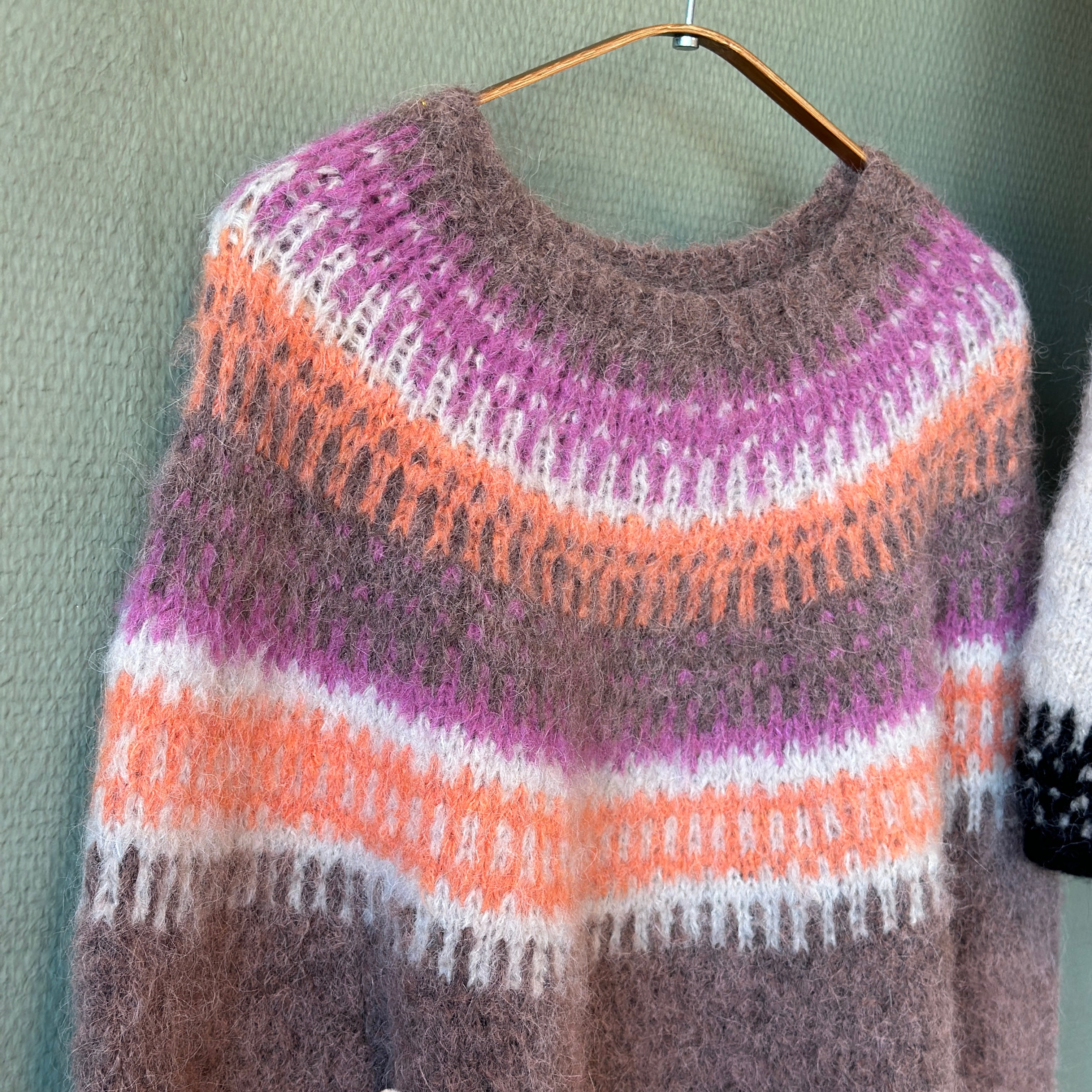 Badge and Bloom er designet af Anne Ventzel og jeg har strikket den i to tråde Altero, et upcycled garn fra Italien. På billedet er mønsterfarven (Farve 1) Pink Lavender 1614, (Farve 2) Soft Sand melange (Farve 3) peach 1618 og bundfarven er Brown 1605