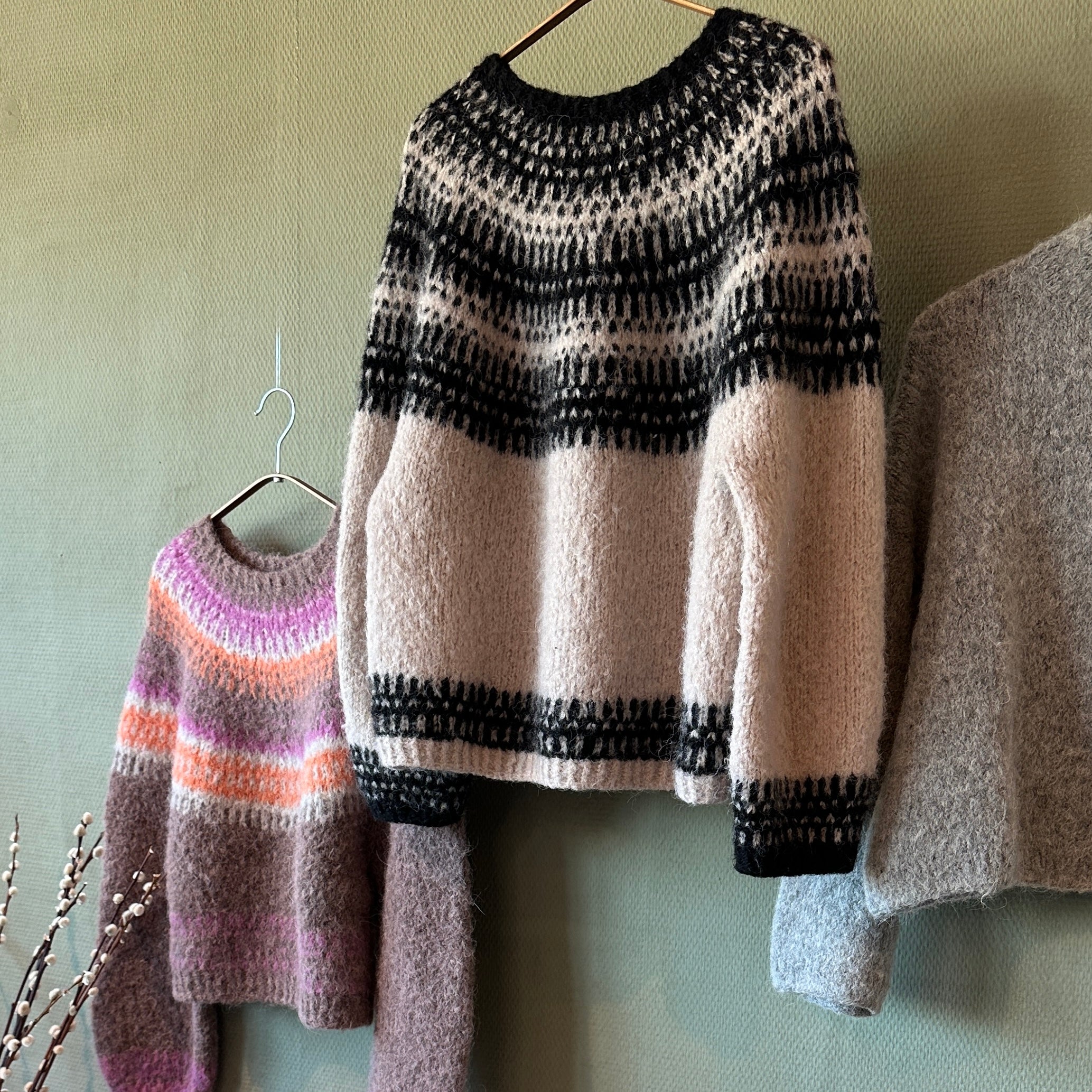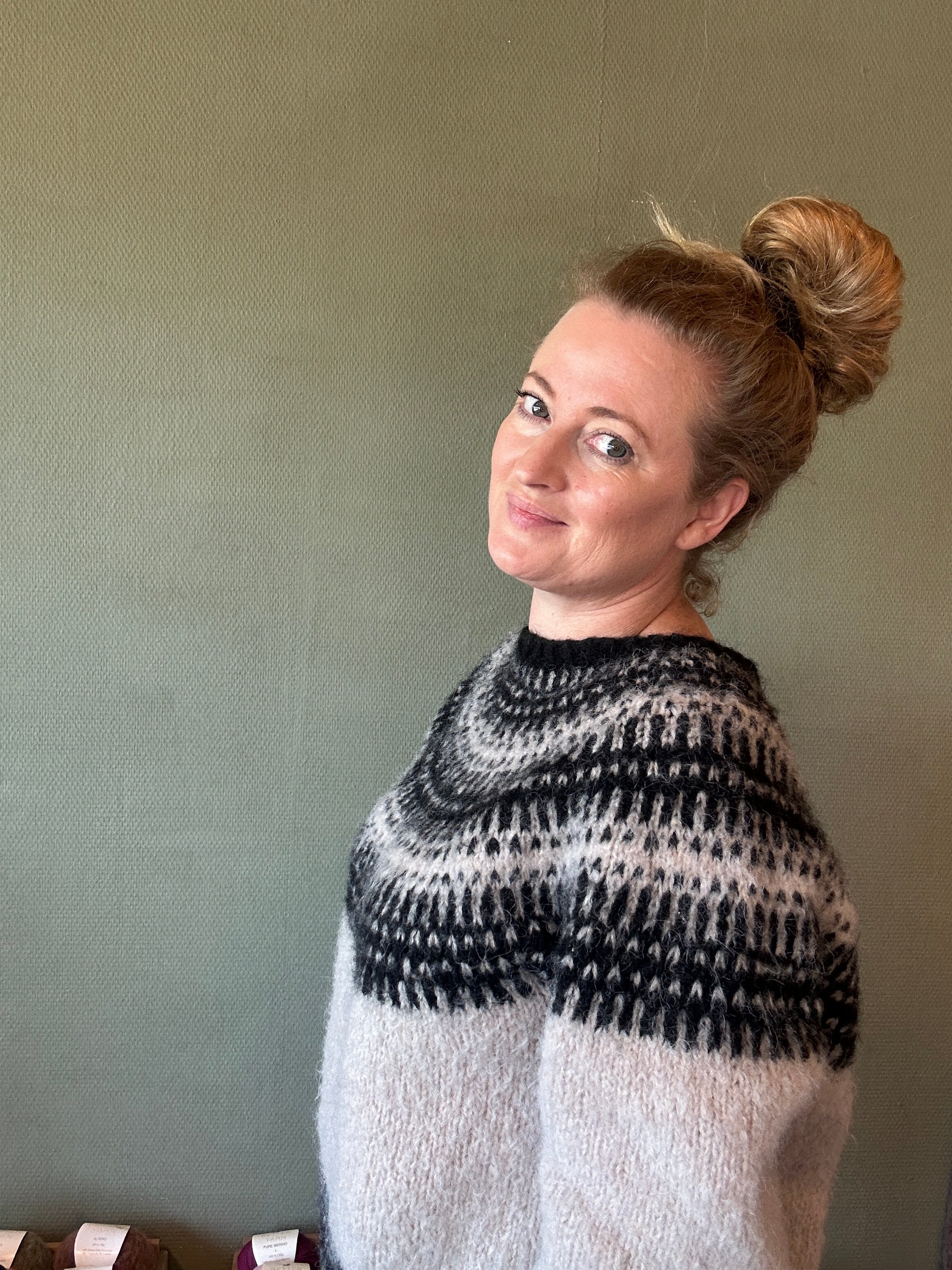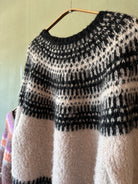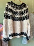 Jeg er vild med denne sweater Badge and Bloom er designet af Anne Ventzel og jeg har strikket den i to tråde Altero, et upcycled garn fra Italien. På billedet er mønsterfarven (Farve 1) Black 1641, og bundfarven (Farve 2) Soft Sand Melange.